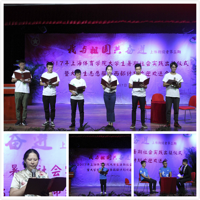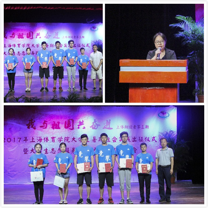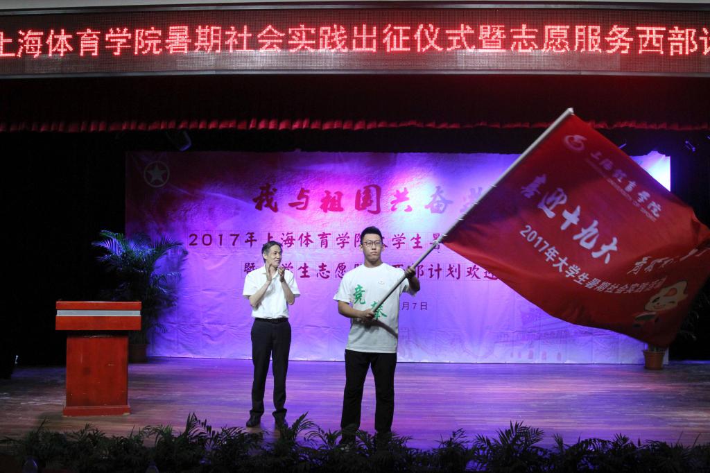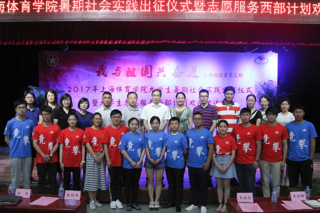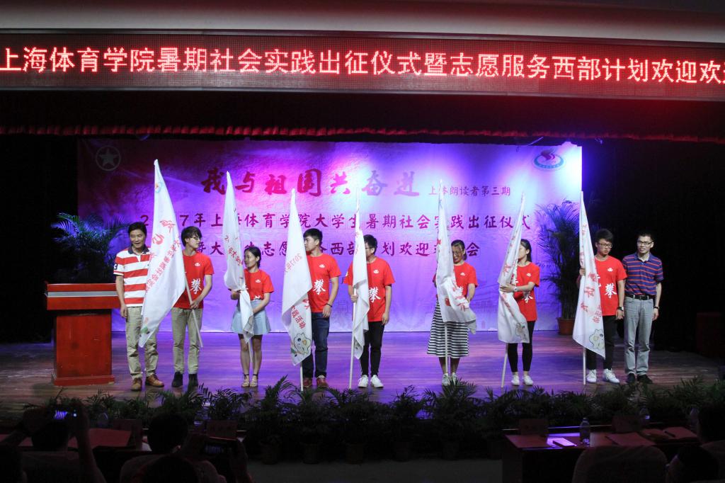本网讯 7月7日下午,2017年上海体育学院大学生暑期社会实践出征仪式暨大学生志愿服务西部计划欢迎欢送会在学生活动中心小剧场举行。党委副书记、副院长陈晓峰出席会议。组织部、宣传部、教务处、武保处、学工部、研工部、后服中心等职能部门负责人,各二级学院党总支副书记、副院长、团总支书记、副书记以及学生代表等一同参加仪式。