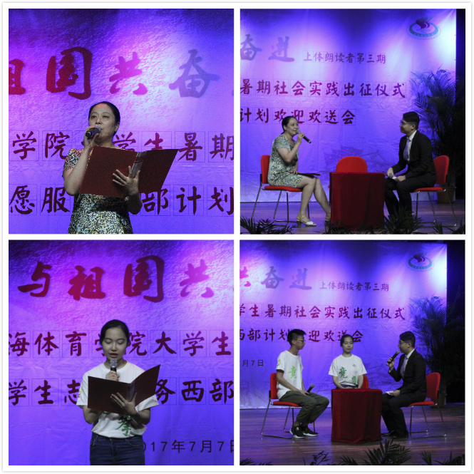 由2015年大学生志愿服务西部计划志愿者、体训学院2012级硕士研究生王靖,2017年大学生志愿服务西部计划志愿者、武术学院2013年级本科生白雨柔讲述了他们最初选择西部计划的初衷。其中王靖已经完成圆满志愿服务期任务,走上了新的工作岗位,他也着重讲了西部计划对他人生的影响。而白雨柔也希望通过参与大学生志愿服务西部计划,更好的实现人生价值。王靖以《努力留下青春的痕迹》祝福各位青年,都能实现青春理想。