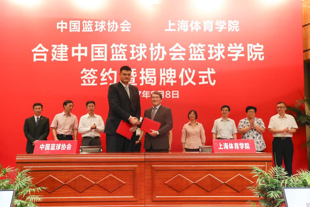 姚明和陈佩杰共同签署《中国篮球协会、上海体育学院“中国篮球协会篮球学院”合作协议》并分别就“中国篮球协会篮球学院”的建设发展谈了思路。中国篮球协会和我院将发挥自身独特优势,集聚我国篮球运动和体育高等教育优质资源,立足上海、服务全国、面向世界,合作打造国内一流、国际知名的特色学院“中国篮球协会篮球学院”。