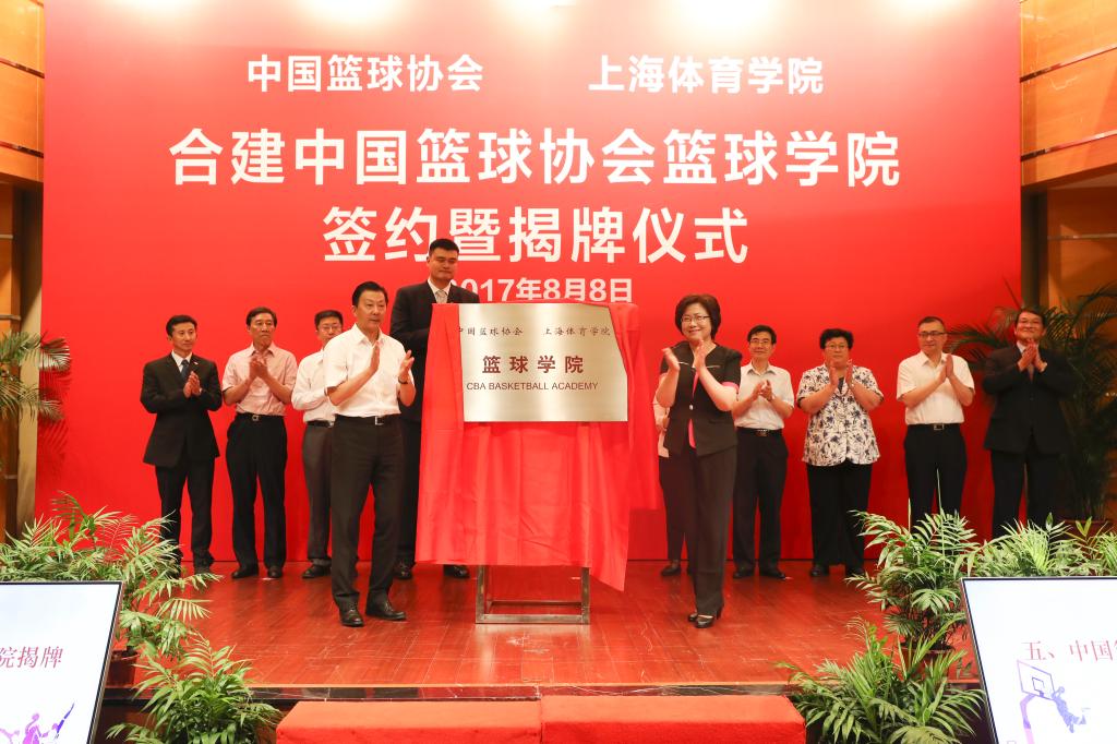 本网讯 8月8日下午,“中国篮球协会篮球学院”签约暨揭牌仪式在我院图文信息楼报告厅举行,国家体育总局副局长李颖川,上海市副市长翁铁慧,上海市政府副秘书长宗明,上海市教委主任苏明,上海市宝山区委书记、上海市篮球协会会长汪泓,中国篮球协会主席姚明,中国大学生体育协会专职副主席兼秘书长薛彦青,中国篮球协会副主席杨桦,中国篮球协会秘书长白喜林,上海市体育局党委副书记李崟,上海体育学院党委书记戴健,上海体育学院党委副书记、院长陈佩杰,上海体育学院党委副书记、副院长陈晓峰,上海体育学院党委副书记、纪委书记詹萌,上海体育学院副院长毛丽娟,上海青少年篮球运动发展中心理事长李秋平,安踏集团董事局主席兼CEO丁世忠,中国篮球协会原副主席、上海市大学生体育协会会长姚颂平等出席揭牌暨签约仪式。揭牌暨签约仪式由戴健主持。