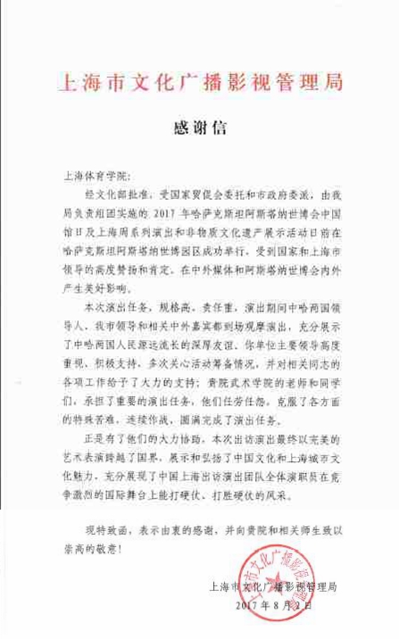 本网讯 日前,上海市文化广播影视管理局发来感谢信,感谢我校师生在哈萨克斯坦阿斯塔纳世博会上的精彩表现,称“武术学院的老师和学生们,承担了重要的演出任务,他们任劳任怨,克服了各方面的特殊苦难,连续作战,圆满完成了演出任务。”“向贵院和相关师生致以崇高敬意!”