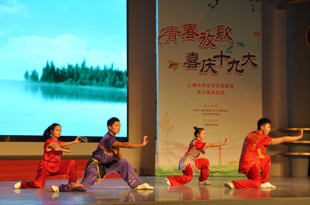 本网讯 11月29日和12月6日晚,两场融合了美妙歌声、多姿舞蹈和绚烂戏曲等节目的演出,让正在东方绿舟军训的逾四千名中学生深深陶醉,“青春放歌 喜庆十九大——上海大学生文化志愿者东方绿舟巡演”在这里上演,我校学生作为上海大学生文化志愿者,带来《蔚然成风》《绳采飞扬》两个精彩节目,赢得了观众阵阵掌声。
