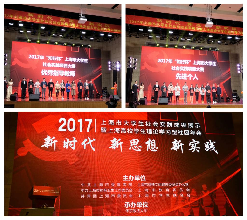 在市委宣传部、市文明办、市教卫工作党委、市教委、团市委和市学联联合主办,华东政法大学承办的2017年“知行杯”上海大学生社会实践大赛中,我校“探寻贵州少数民族体育文化及其异地再生长”阳光筑黔赴贵州隆昌小学公益支教活动荣获二等奖,“行走西部的蜕变——上体赴西部志愿服务调研实践团”、“第十三届全国运动会对天津市市民体育运动参与意向影响的研究”、“光辉岁月90载、和平丝路国门行——上体体训学子赴一带一路西线第一哨阿拉山口边防连庆祝建军90周年主题教育活动”等三个项目获三等奖,我校王少白、刘云龙两位老师获“市优秀指导教师”称号,张隽茂、谢天获“市先进个人”称号。 其中,“行走西部的蜕变”赴西部体育志愿服务调研队还获得了团中央“厉害了我的国”视频评选二等奖。此外,在2017年全国大中专学生志愿者暑期“三下乡”社会实践活动总结评比中,经管学院云南砚山暑期社会实践团荣获2017年全国大中专学生志愿者暑期“三下乡”社会实践活动优秀实践团队;在2017年全国大中专学生“三下乡”社会实践“千校千项”成果遴选活动中,我校体育休闲与艺术学院“爱造奇迹,梦造人生”——赴贵州铜仁支教项目入选“下乡情怀好日记”名单;我校经济管理学院“17再出发 滇沪携手行”——上海体育学院赴云南砚山项目入选“深化改革行知录”名单。
