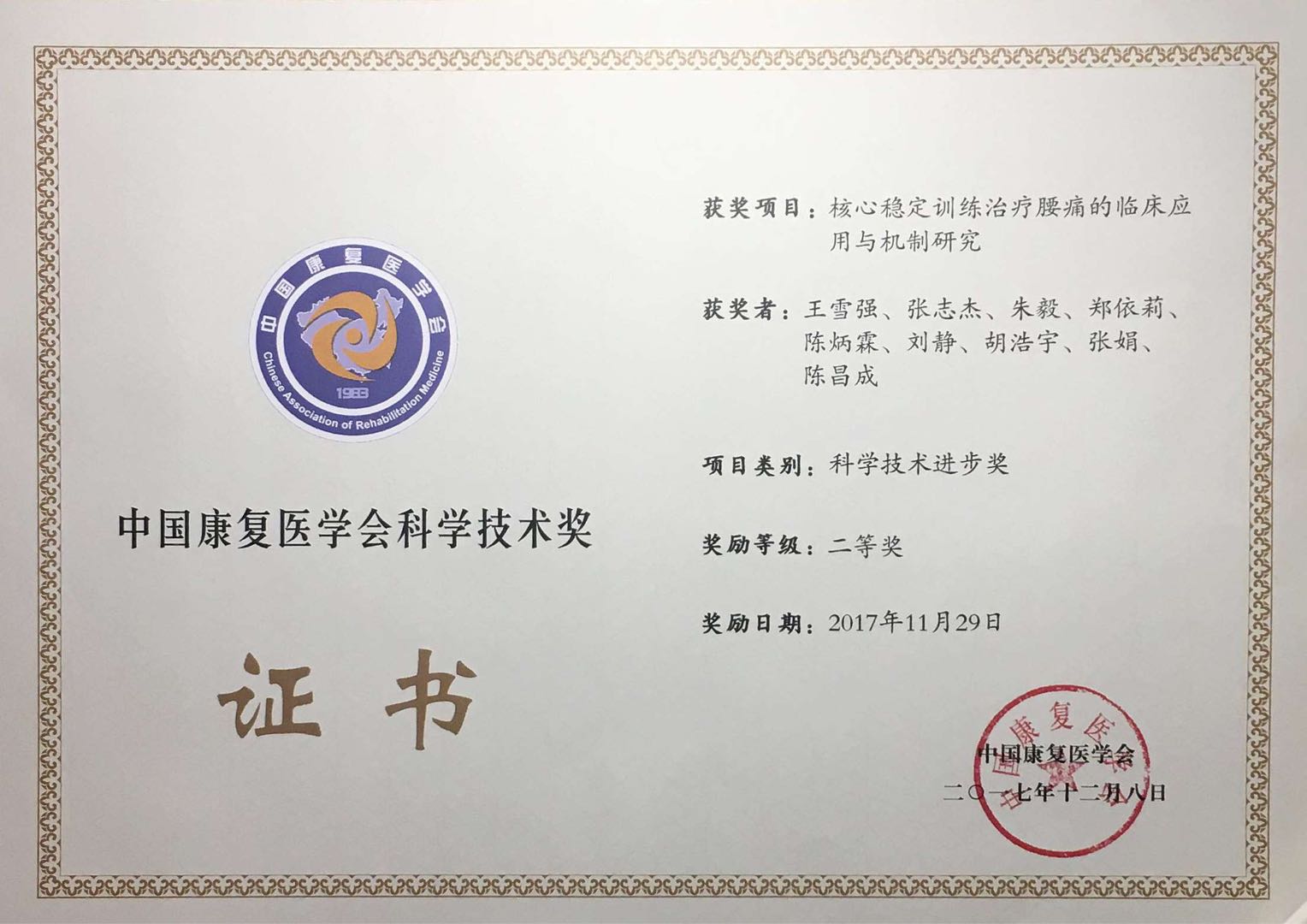 本网讯 12月8日晚上,2017年度首届中国康复医学会科学技术奖颁奖典礼在北京国家会议中心举行,中国康复医学会方国恩会长亲自为获奖者颁奖。我校王雪强博士团队完成的“核心稳定训练治疗腰痛的临床应用与机制研究”获科技进步二等奖。主要完成人为:王雪强,张志杰,朱毅,郑依莉,陈炳霖,刘静,胡浩宇,张娟,陈昌成。