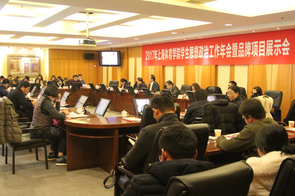 本网讯 为学习宣传贯彻党的十九大及全国高校和上海市高校思想政治工作会议精神,全方面展示我校大学生思想政治工作和基层单位品牌项目成果,12月21日,上海体育学院2017年学生思想政治工作年会暨品牌项目展示会在图文信息楼一楼会议室召开。党委书记戴健,党委副书记、副院长陈晓峰,党委副书记、组织部长潘勤出席会议。会议分上下两场,分别由学工部部长熊小健、研工部部长殷勤主持。