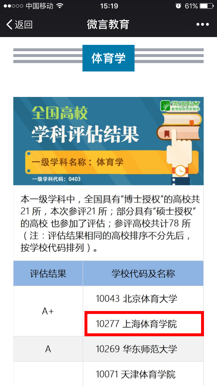 本网讯12月28日,教育部学位与研究生教育发展中心公布了全国第四轮学科评估结果,我校从参评体育学一级学科的78所高校中脱颖而出,获得体育学一级学科A+档。