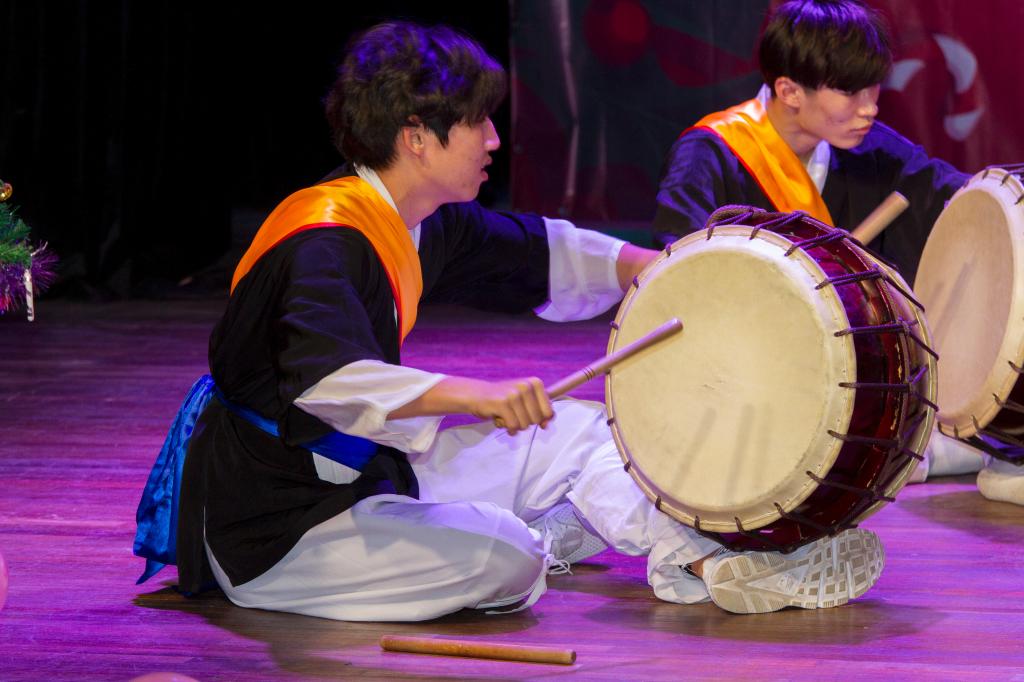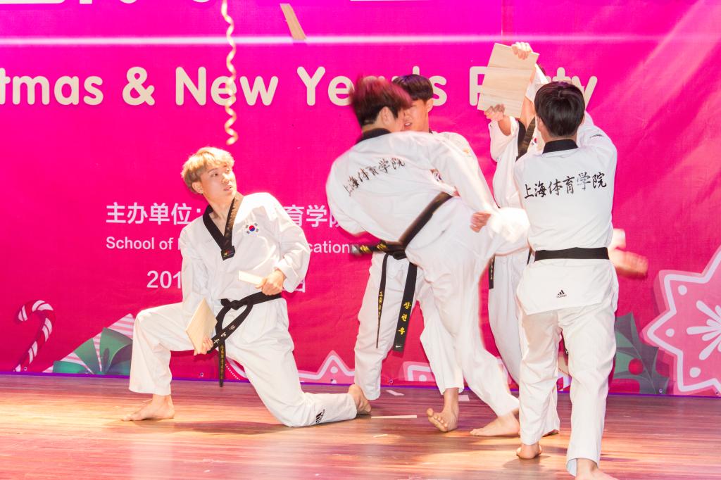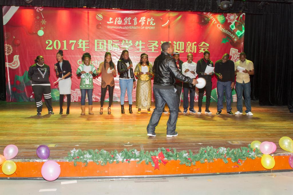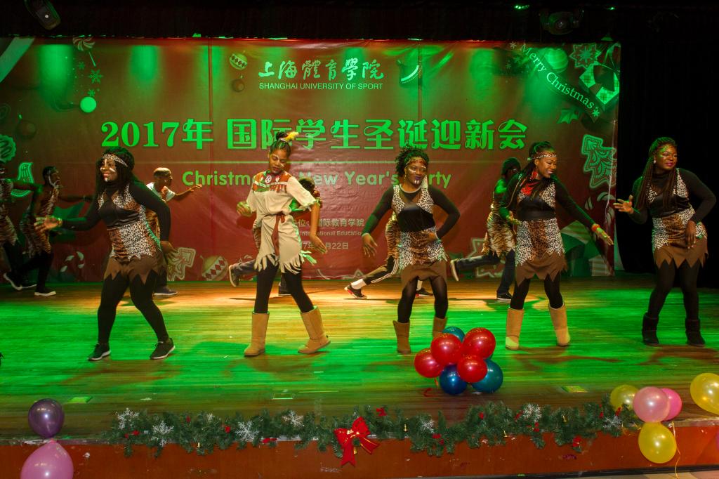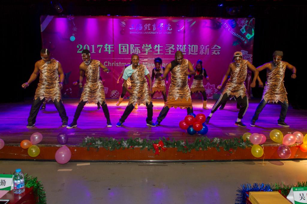 开幕式后,留学生献上精彩的文艺表演。美国学生永逸用他的动感Hip-pop开场,他的舞步飞凌、气场炫酷,引得全场欢呼。紧跟着,越南同学身着民族服饰,献上一段小清新快闪舞蹈,衣袖飘扬,绿如草原,红如爱情,蓝如海洋,黄如暖日。俄罗斯同学带来一首名族歌曲,仿佛唱出了民族灵魂和文化之光,引人遐想。蒙古圣诞歌曲、非洲圣诞歌曲畅快传递着节日的欢愉、轻松、活泼。一首《水调歌头》诗歌朗诵,来自亚非欧国家的留学生们声情并茂、字正腔圆,抑扬顿挫中颇有中国古典文化的神韵。跆拳道—前踢、下劈、横踢、旋风踢、双飞、后旋踢、跳后踢…哼哼哈嘿,这是韩国留学生们每年都要展示的节目,告别平日里的懵懂嘻哈,这群韩国留学生神情严肃,一招一式间诠释着跆拳道的核心精神—礼仪、廉耻、忍耐、克己、百折不屈。一曲深沉静雅的古典乐曲,古巴留学生带来了一场太极表演,以心行气,以气运身,以意贯指。咚咚咚,阵阵鼓声,韩国学生的“四物”表演开始了。留学生们盘腿而坐,身体摆动,手势转换,面带微笑,彼此颔首点头,利用京锣、铜锣、长鼓、鼓四种打击乐器,奏出欢快有力的节奏,沉浸其中,演绎着韩国广受欢迎的民间农乐。越南留学生一曲深情的“十年”和“那些年”却又将人的思绪拉回想要遗忘却总是难忘的青葱岁月。末了,一曲没有休止符的非洲集体舞,为这场迎新会镌刻了永远的青春和活力。非洲各国的留学生们身着豹纹背心,面涂黑白油彩,穿梭在舞台,转啊转,一场古朴粗犷的民俗风情….台下观众登台共舞,仿佛回到那广袤的热带草原。