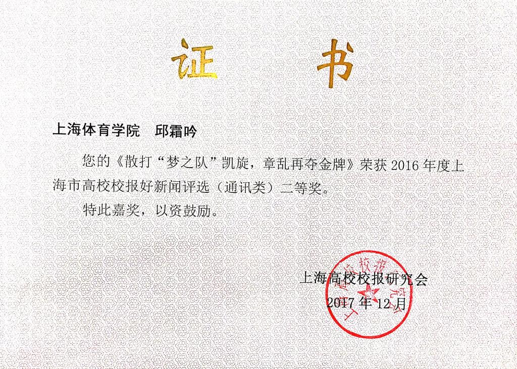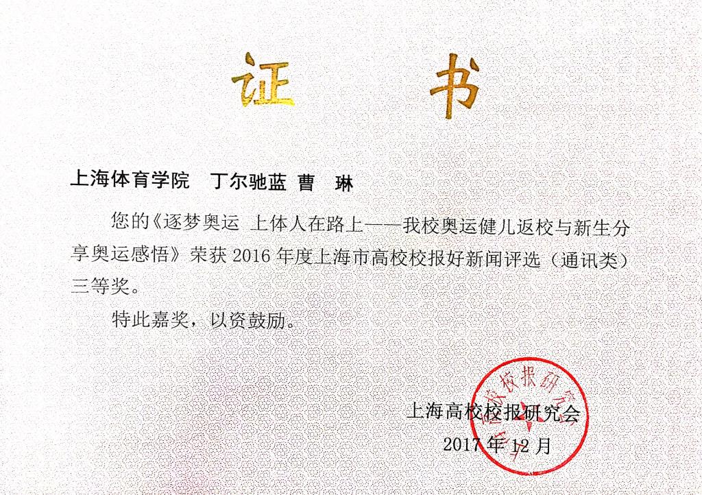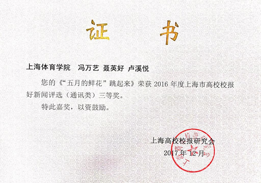 由邱霜吟撰写的《散打“梦之队凯旋” 章乱再夺金牌》荣获好新闻评选通讯类二等奖,由丁尔驰蓝、曹琳撰写的《逐梦奥运 上体人在路上——我校奥运健儿返校与新生分享奥运感悟》荣获好新闻平寻通讯类三等奖,由冯万艺、聂英好、卢溪悦撰写的《“五月的鲜花”跳起来》荣获通讯类三等奖。由党委宣传部董杨华制作的消息和报纸版面分别获得消息类一等奖和版面类二等奖。
