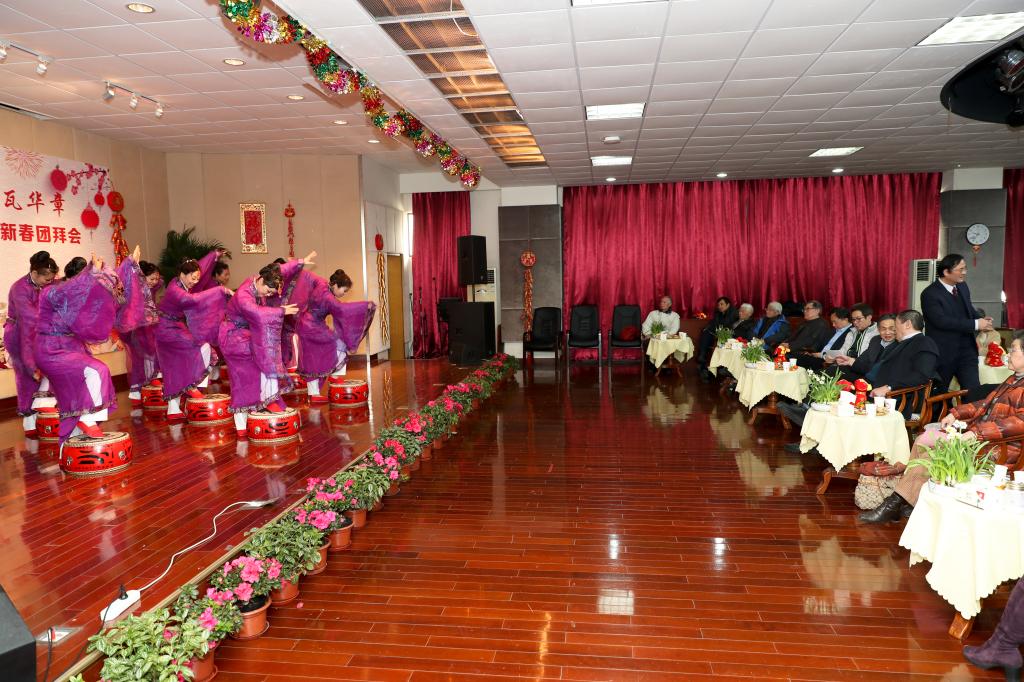 在喜庆祥和的氛围中,大家一同观看了教工文艺爱好者献上的精彩文艺节目。舞蹈《子吟》展示了退休教职工们的风采,啦啦操《中年少女》赢得一阵阵热烈的掌声,留学生的《绒花》独唱满怀深情,朗诵《走进新时代》让与会者共同期待中华民族伟大复兴、强大中国梦早日实现。节目的最后,校领导戴健和陈晓峰、詹萌信笔挥毫,为大家送上新春祝福。幸福吉祥如意,共祝全校师生员工在丁酉新年里身体健康、工作顺利、阖家幸福、吉祥如意!祝福学校改革和事业发展取得更大的成就!