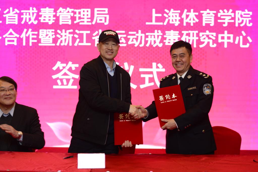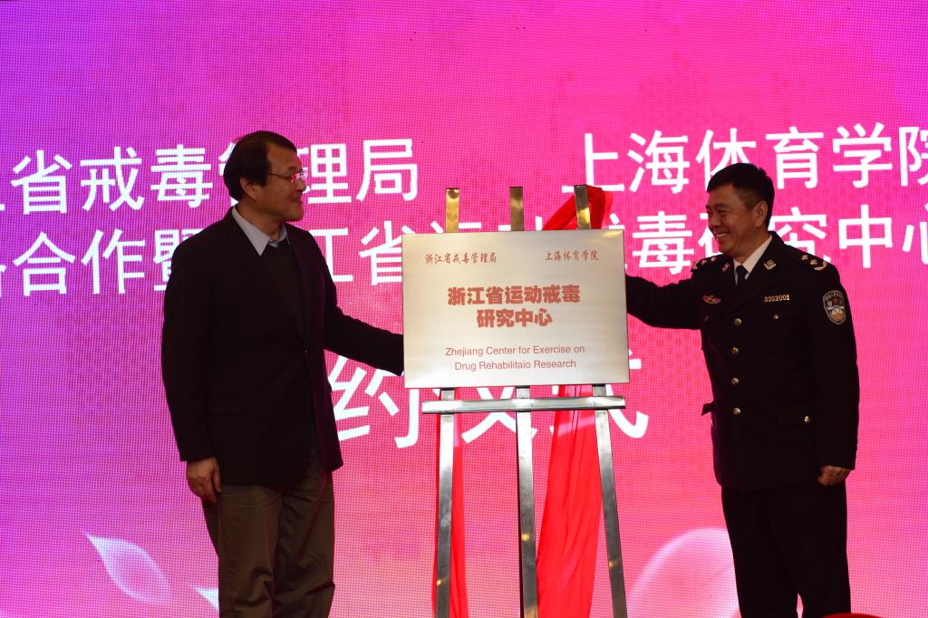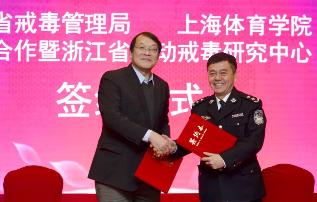 本网讯 3月1日,我校与浙江省戒毒管理局达成战略合作协议,共建“浙江省运动戒毒研究中心”、“浙江省运动戒毒研究基地”以及“国社科重大项目合作研究”。上海体育学院与浙江省戒毒管理局为共同解决运动戒毒领域的科学难题的国内首家运动戒毒研究中心——浙江省运动戒毒研究中心也在签约仪式上揭牌成立。运动戒毒研究中心旨在为中国药物成瘾群体提供适合运动锻炼的精准化康复方案。上海体育学院党委副书记、院长陈佩杰、国社科重大项目首席专家周成林教授等一行10人受邀出席仪式。浙江省戒毒管理局局长陈玉海、副局长姚永清、省莫干山女所政委吕素兰、省十里坪强制隔离戒毒所政委鲍胜桥等戒毒局相关人员出席签约仪式。会议由浙江省局副局长姚永清主持。