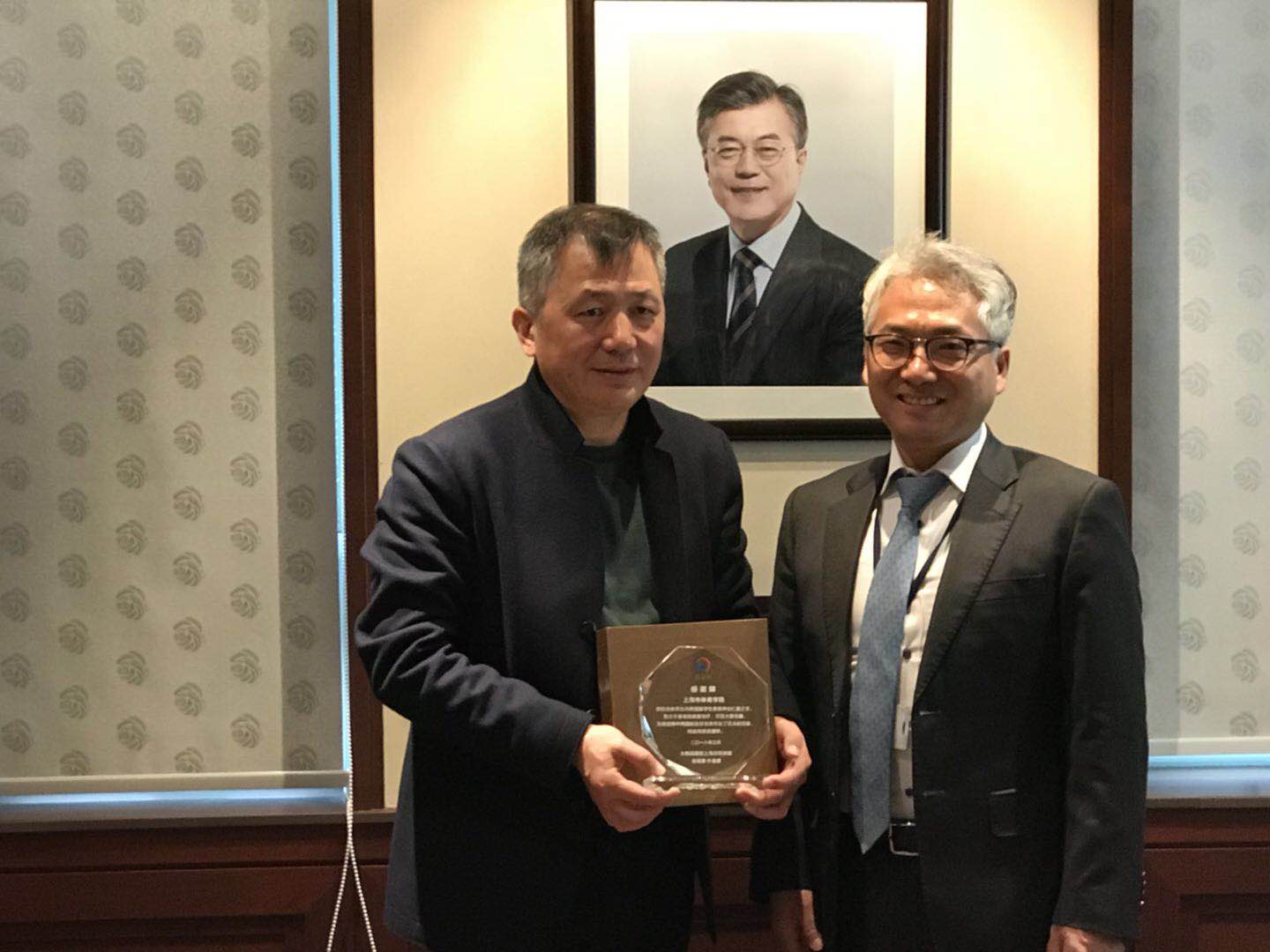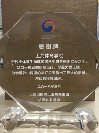 本网讯 3月7日,韩国驻上海总领事馆总领事授予我校感谢牌,感谢我校全体师生向韩国留学生患者伸出仁爱之手,致力于患者康复治疗所做出的努力,尽显大爱无疆。上海体育学院副院长王兴放、上海体育学院国际教育学院副院长朱东受邀前往大韩民国驻上海总领事馆接受感谢牌。