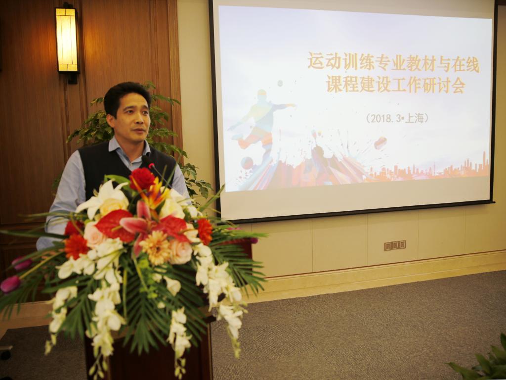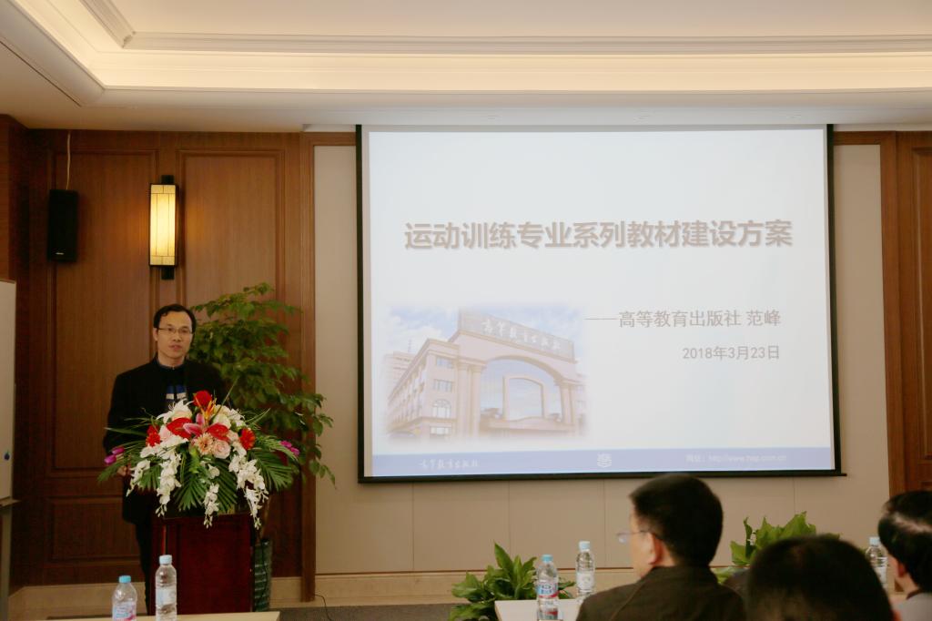 高等教育出版社体育分社范峰首先介绍了项目及运动训练专业系列教材建设方案。指出该项目的主要目的是给全国优秀运动员提供基础的理论教学服务,为运动员的文化教育提供一套完整的课程学习解决方案,实现运动训练专业“课程共享、自主学习、线上线下结合”。并提出同步推进相关教材的建设,最终达到“平台+课程+教材”一体化教学。