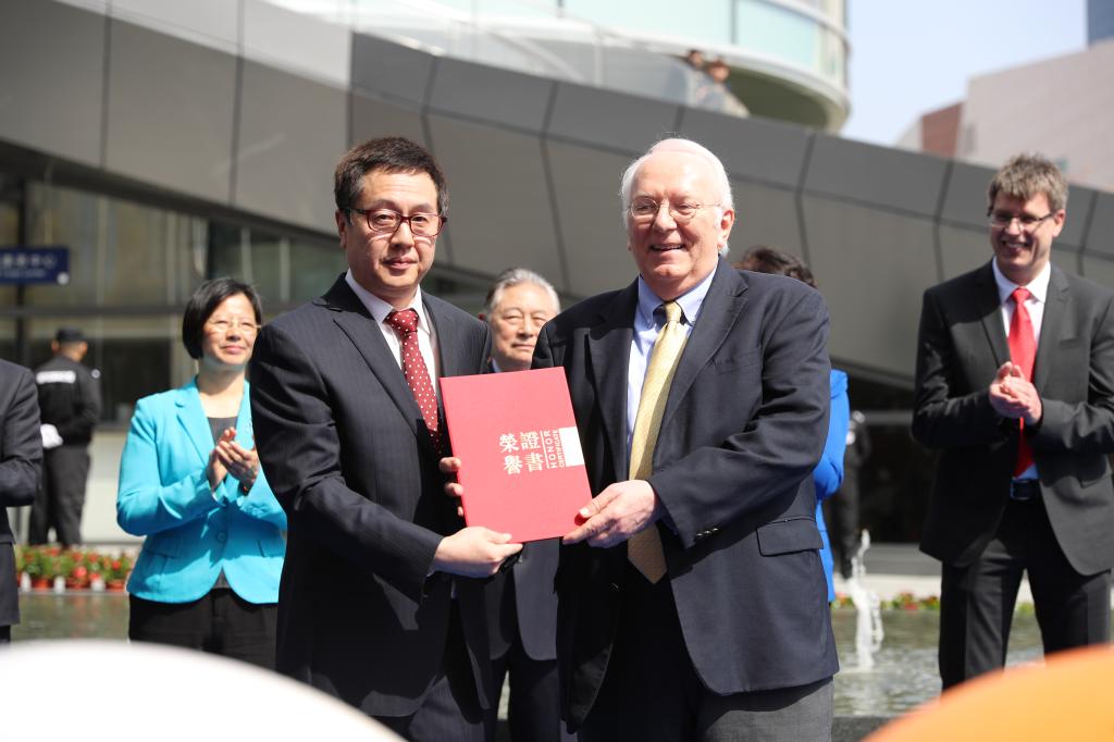 在仪式上,国际乒联副主席、“乒博馆”馆长施之皓向国际乒联博物馆前馆长查克•霍伊先生颁发“荣誉馆长”证书。