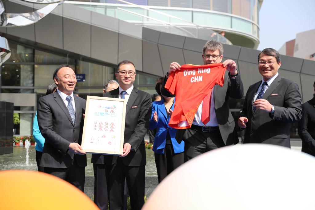托马斯•维克特和国家体育总局乒羽中心主任雷军代表国际乒乓球联合会、中国乒乓球协会向“乒博馆”捐赠了丁宁在2016里约奥运会上的比赛用服和为纪念中马建交45周年,由马尔代夫政府发行的丁宁和刘诗雯合影纪念邮票。上海体育学院党委书记李崟、上海体育学院党委副书记、院长陈佩杰接受藏品。