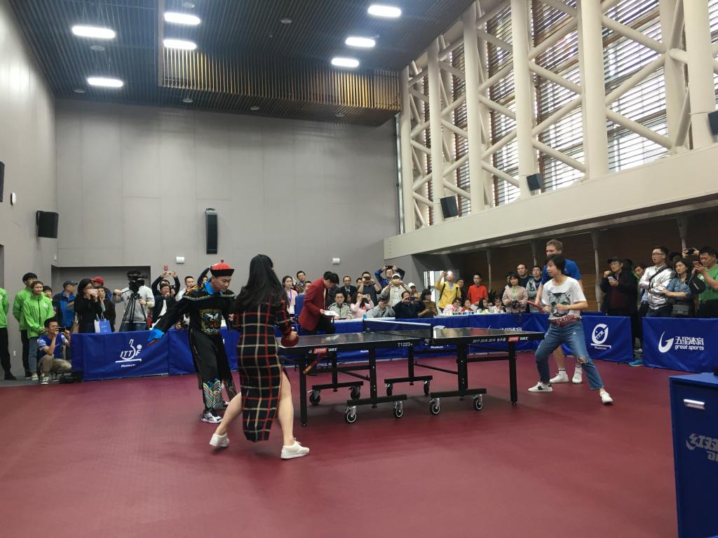 3月31日下午2点在“乒博馆”二楼冠军堂,举行了一场别开生面的“穿越时空来挑战”世界冠军“嗨皮挑战赛”,张怡宁、佩尔森2名世界冠军与9位业余选手进行车轮战。首批参观的100余名观众观看比赛,一睹挑战赛的精彩和世界冠军的风采。