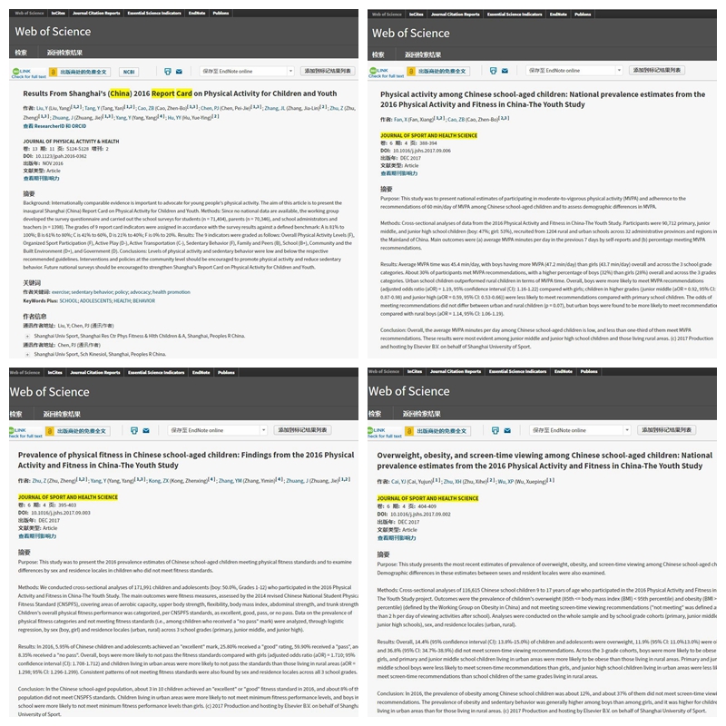 上海体育学院学生体质与学校体育研究团队于2015年11月首次发布了上海市儿童青少年体育健身指数,教育部体育卫生与艺术司和上海市教委都给予高度评价。此后连续两年,受教育部体卫司委托,由上海体育学院负责在全国推广开展该项工作的调研。依据研究成果所撰写的决策咨询报告分别得到了国家和省市领导人的正面批示,为国家及相关省市推进青少年体质健康工作产生积极的建言献策作用。此次入选ESI的四篇论文,分别报告了团队在我国儿童青少年身体活动(图1)、体质健康(图2)、超重肥胖和屏幕时间(图3)、国际青少年身体活动报告卡(图4)方面深入研究的成果。
