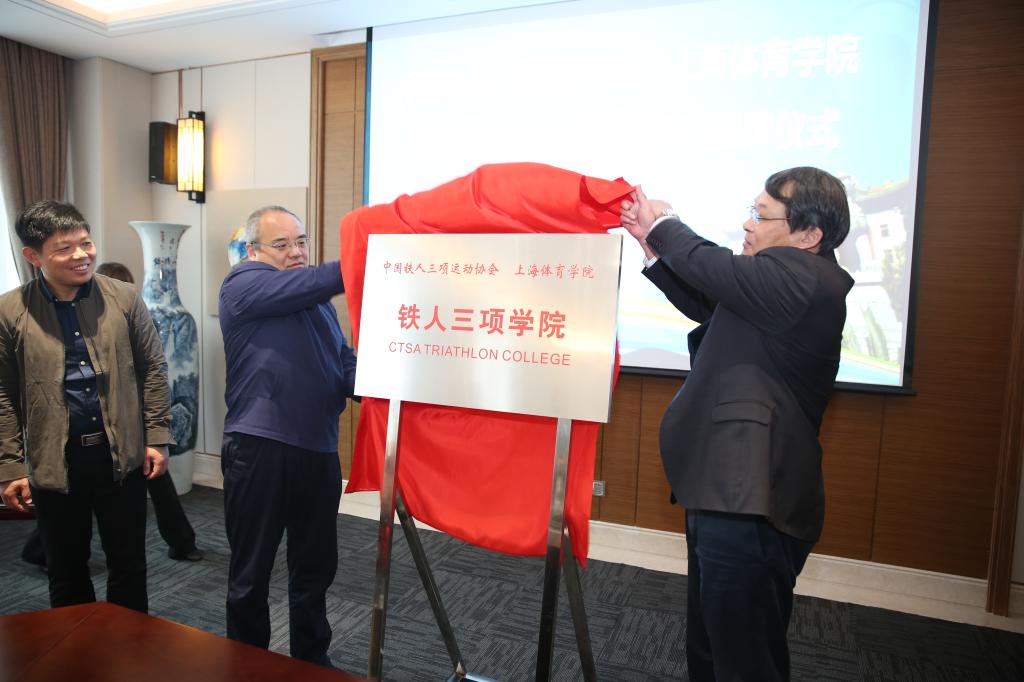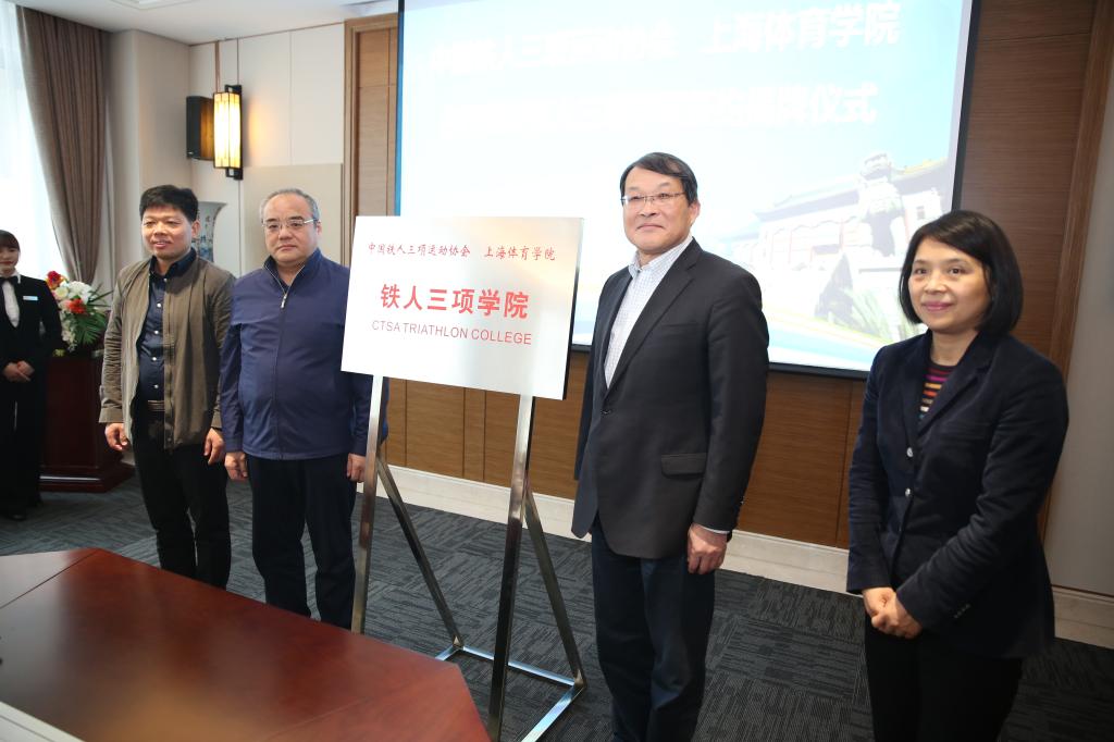 陈佩杰与中国铁人三项运动协会主席张健签署《关于共建中国铁人三项学院的协议》并进行揭牌。体育休闲与艺术学院院长李海对中国铁人三项学院的筹建情况做了介绍。