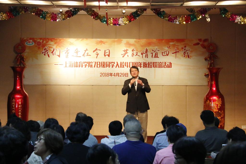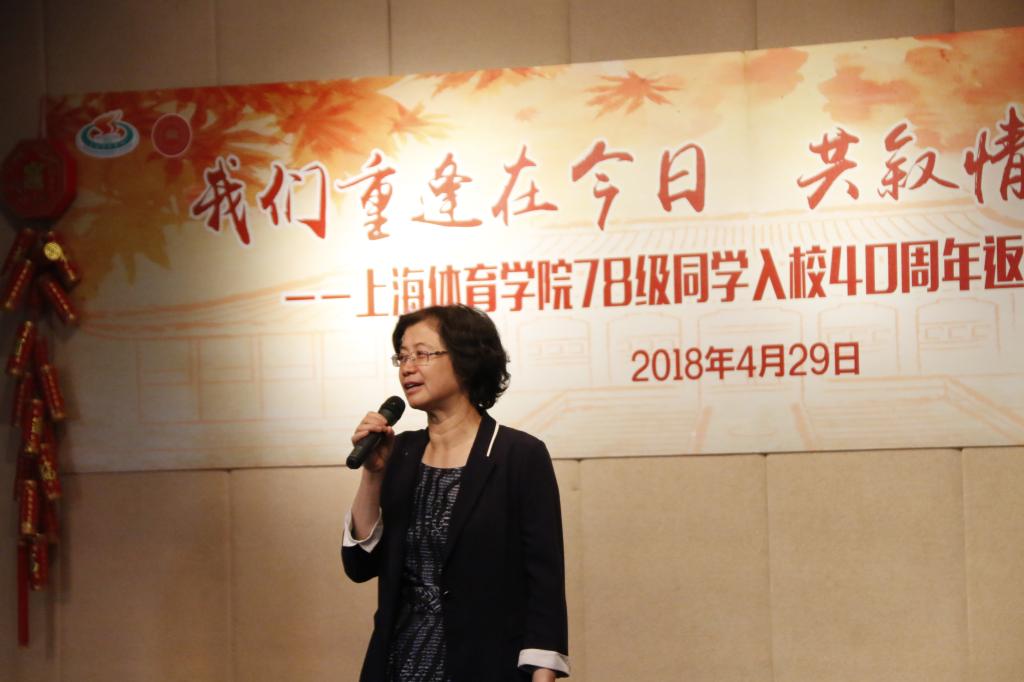 本网讯 4月29日,“我们重逢在今日,共叙情谊四十载”——上海体育学院1978级本科校友举办了入学四十周年联谊活动,近一百七十位校友从世界各地归来,重聚母校,共叙同窗情谊。29日上午10:00,78级校友入学40周年秩年返校联谊活动在上海体育学院工会多功能厅举行。党委副书记、院长陈佩杰,党委副书记、纪委书记、78级同学詹萌,副院长平杰出席联谊会。本次联谊会由78级校友、现任上海大学工会主席顾红主持。