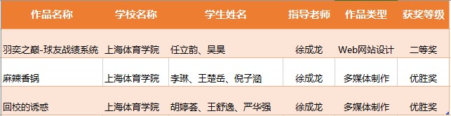 由经管学院徐成龙老师指导,任立韵和吴昊同学参赛的“羽弈之巅-球友战绩系统”作品荣获Web网站设计类别二等奖,这也是我校近年来在此类别获得的最高奖项;由徐成龙老师指导,李琳、王楚岳和倪子涵同学参赛的“麻辣香锅”作品荣获多媒体制作类别优胜奖;由徐成龙老师指导,胡婷荟、王舒逸和严华强同学参赛的“回校的诱惑”作品荣获多媒体制作类别优胜奖。