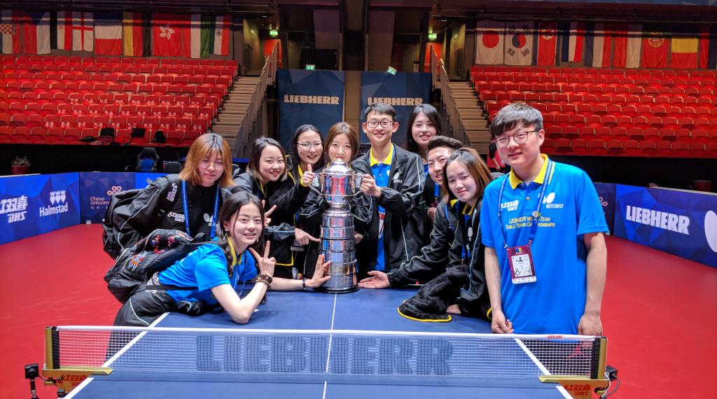 本网讯 2018年团体世界乒乓球锦标赛于4月29日-5月6日在瑞典哈尔姆斯塔德举行,国乒男队完胜德国队实现九连冠,国乒女队击败日本队实现四连冠,这也是中国队第21次捧起斯维斯林杯和考比伦杯。在本次比赛中,我校师生也身兼重任,从运动员、教练员到志愿者、科研服务都离不开我校师生的努力和付出,我校师生也圆满完成了光荣的使命。