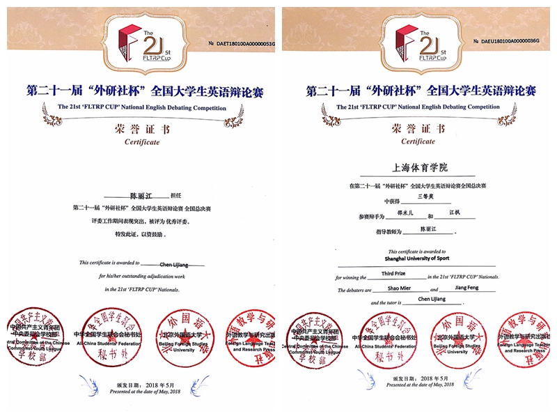 本次总比赛的110多支高校代表队选拔自华东、华西、华南、华北四大赛区的近500多支高校队伍,其中包括清华大学、北京大学、人民大学、香港大学、澳门大学、北京外国语大学、上海财经大学等全国一流高校。上海体育学院新外学院学生邵米儿和江枫在华东赛区比赛中获二等奖,晋级5月17-22日的全国总决赛,与来自全国214名辩手们同场角逐。比赛节奏紧张,赛前仅有15分钟准备时间,每场比赛正反方和上下院角色不停轮换。辩题涉及经济政策、教育问题、男女平权、历史事件、国际关系、刑罚制度等诸多国内外社会热点问题,对参赛辩手的批判性思维提出了巨大挑战。我校两名学子在八轮循环赛中“唇枪舌战”又不时沉着冷静,展示了英辩选手们的风采。
