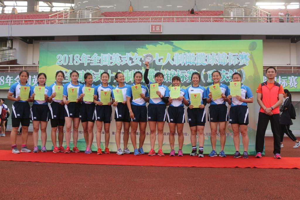 本网讯 5月26至27日,全国英式女子七人制橄榄球在重庆市永川区体育中心举行。经过两天的激烈角逐,上海女队四胜二负,最终站上领奖台,获得本届全国女子七人制橄榄球锦标赛季军。本次比赛总共有山东、江苏、上海等七支女子队伍参加了此次比赛。