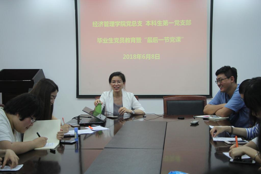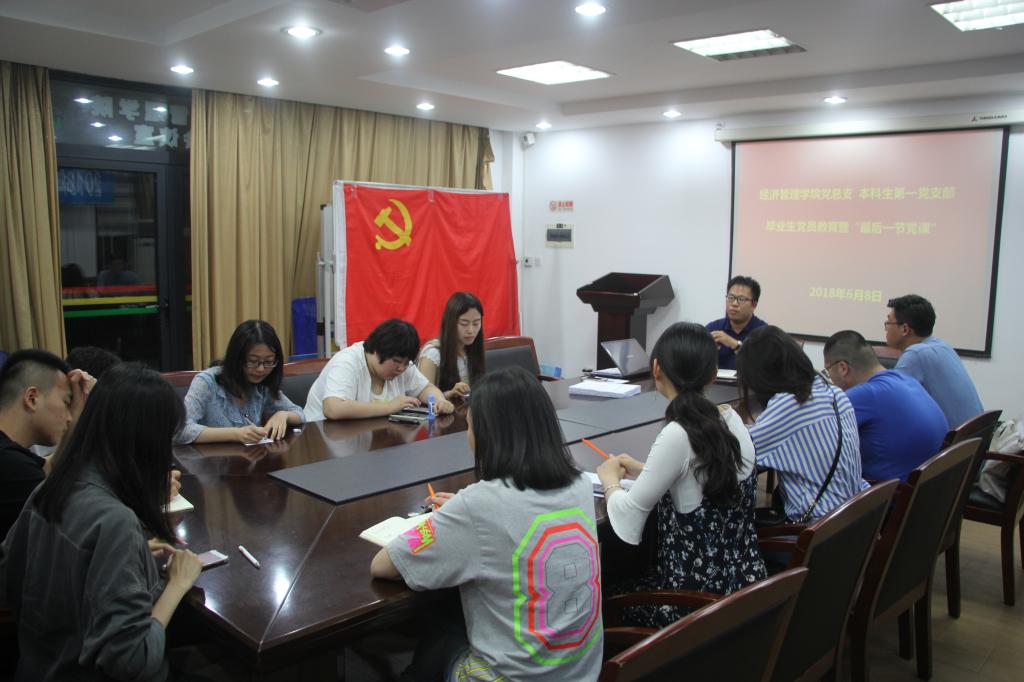 本网讯 6月8日,经济管理党总支本科生第一党支部召开全体党员大会,对即将毕业离校的本科生党员进行毕业前“最后一节党课”教育。经济管理学院党总支副书记熊静为毕业生党员讲授党课,党总支专职组织员刘建向党员讲解组织关系转接的相关事项。党支部书记徐共强主持会议,支部全体党员参加本次大会。