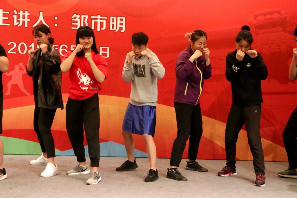 在随后的拳手手靶表演和与学生互动学拳的环节中,嘉宾的精彩表演和现场观众的热情参与使得现场的氛围不断升温。现场游戏环节的开展又一次将现场气氛推向高潮,两副带有邹市明签名的拳套,现场赠送给游戏获胜者,邹市明也对参与互动的在校拳击专业学生进行了鼓励。