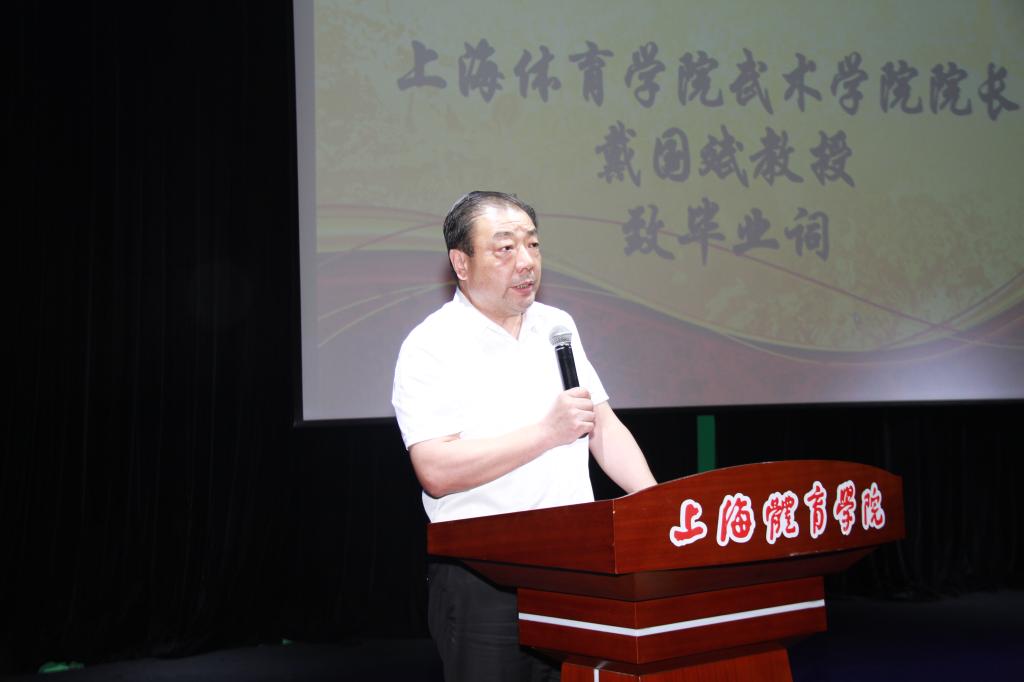 戴国斌作了题为《建设好四个门户,赢得人生新突破》的致辞,祝贺全体毕业生顺利毕业,并表达了学院与毕业生难舍的眷恋之情,同时为上体武术人的成长成熟感到骄傲。他希望各位毕业生以“上体武术门户的师生情”作为人生发展的起点,以“家庭门户的亲人情”作为人生发展的大后方,以“单位门户的同事情”作为人生发展的纽带,以“志向门户的同志情”作为人生发展的理想,衷心希望各位毕业生正视武术门户对人生发展的意义,在各自人生不同阶段“4个门户”建设中,不仅收获甜蜜的爱情、组建幸福的家庭,而且找到各自事业发展的同路人,开辟人生事业的新战场、持续取得人生的新辉煌。