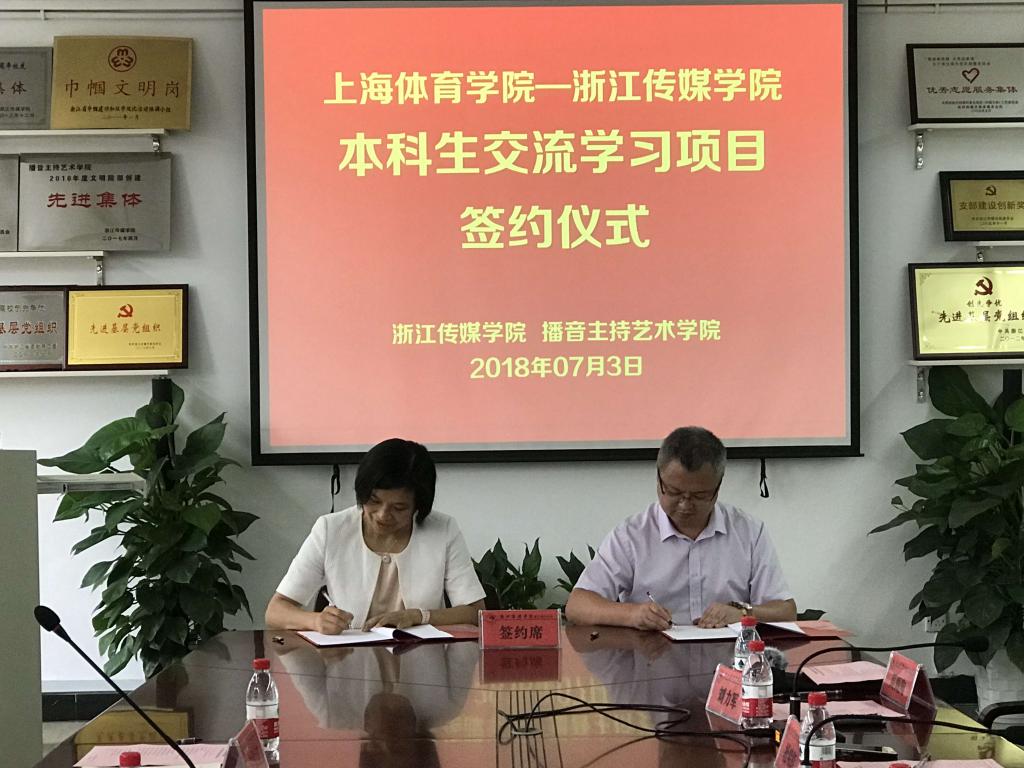 本网讯7月3日,上海体育学院一行4人在副院长毛丽娟带领下赴浙江传媒学院进行访问交流。经过前期深入考察以及学校研究决策,两校签订了《上海体育学院-浙江传媒学院本科生交流学习项目协议书》。浙江传媒学院副院长姚争、教务处长肖国飞、播音主持艺术学院党委书记王临珅、院长杜晓红,上海体育学院体育新闻传播与外语学院党政负责人、播音主持专业负责人等出席签约仪式。