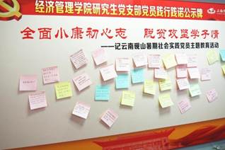 经济管理学院研究生党支部在七一前夕,结合连续11年开展的云南砚山暑期社会实践活动,开展了“全面小康初心志,脱贫攻坚学子情”云南砚山暑期社会实践党员主题教育活动。活动以云南砚山暑期社会实践经历和党员成长分享为主题,通过“十九大精神”学习分享、“山河不倒,爱心常在”主题分享、“不忘初心跟党走,集聚脱贫攻坚正能量”感悟分享、“18再出发,滇沪携手行”以情续爱心、“精准识别、精准帮扶”践行践诺等形式,深刻领会新时代中央重大决策部署,引导党员切实增强不忘初心跟党走的自觉性、坚定性,强化党员初心使命担当。