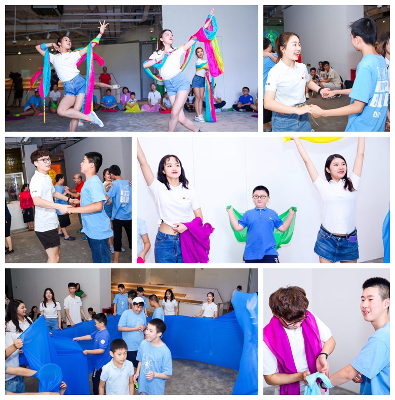 本网讯 7月23日上午,中国第一高楼上海中心大厦举办的丝路敦煌文化艺术展迎来了一批特殊观众,几十名来自上海市彩虹雨儿童智能训练中心的自闭症儿童在休艺学院“星希望”自闭症儿童舞蹈治疗暑期社会实践志愿者们的陪同下,共同参与“幸福生存-丝路敦煌公益融合夏令营”,感受丝绸之路敦煌文化的魅力。