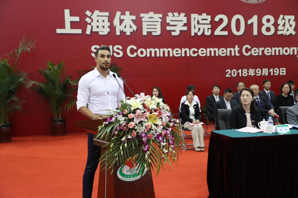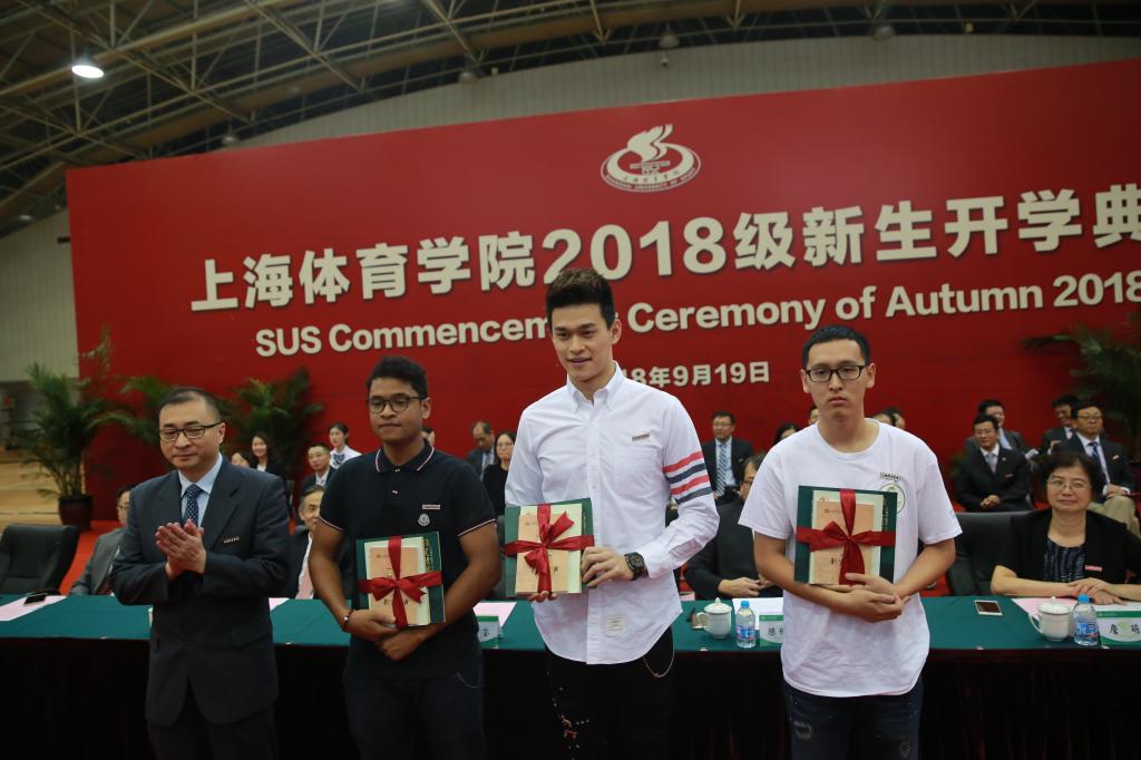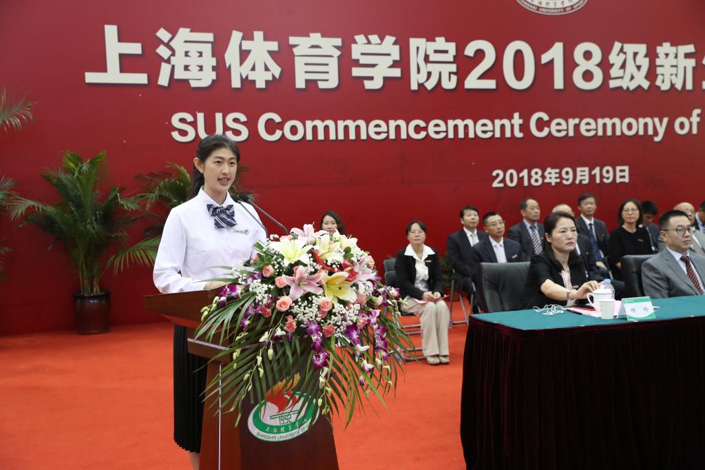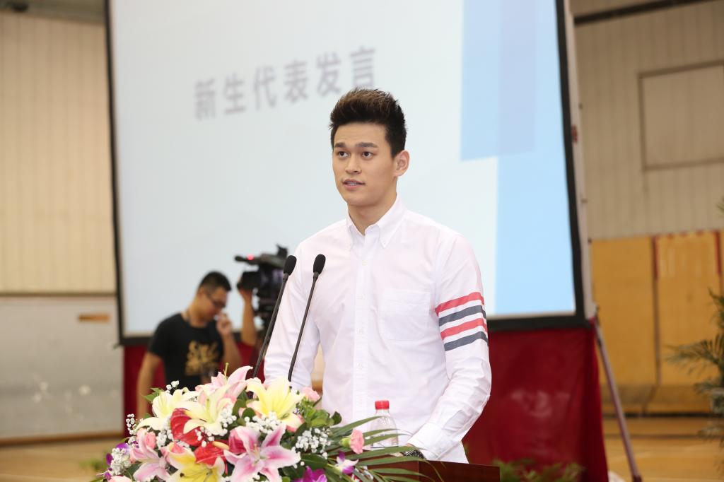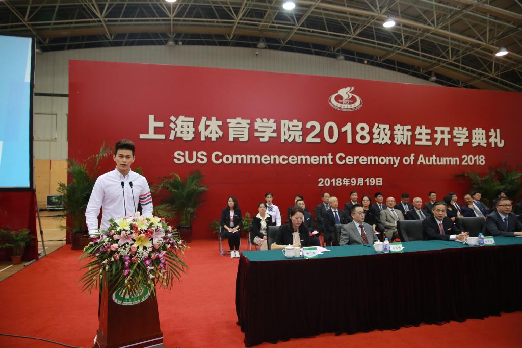 运动人体科学专业博士研究生、奥运冠军孙杨作为新生代表发言。他说,中国体育事业正在蓬勃发展,新时代赋予了上体学生更高的期望和使命,新生们不仅仅是为了训练和比赛而来,在上体学到的每一份知识,将来都有可能化为建设“体育强国、健康中国”的一份动力。应当努力传承上体“兴体报国”的光荣传统,努力成为体育强国征程的亲历者和参与者。应当认真体悟“身心一统,兼蓄竞攀”的校训,努力成为“创变”一代,因为体育而懂得生活、全面发展,担当新一代上体人继往开来的重任和职责。