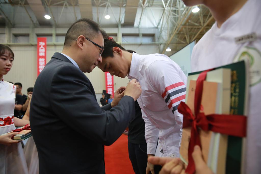 开学典礼在庄严的国歌声中拉开帷幕。党委书记李崟为新生代表佩戴校徽并赠送书籍,希望新生们珍惜光阴、热爱学校、脚踏实地、严谨求实,努力为上体争光添彩。