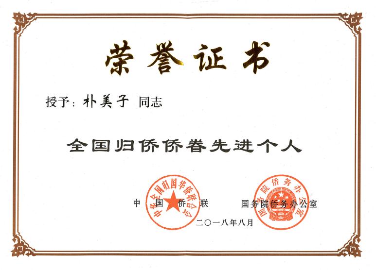 在中国侨联、国务院侨组织的中国侨界杰出人物和全国归侨侨眷先进个人评选活动中,我校侨联副主席朴美子老师获得全国归侨侨眷先进个人称号。