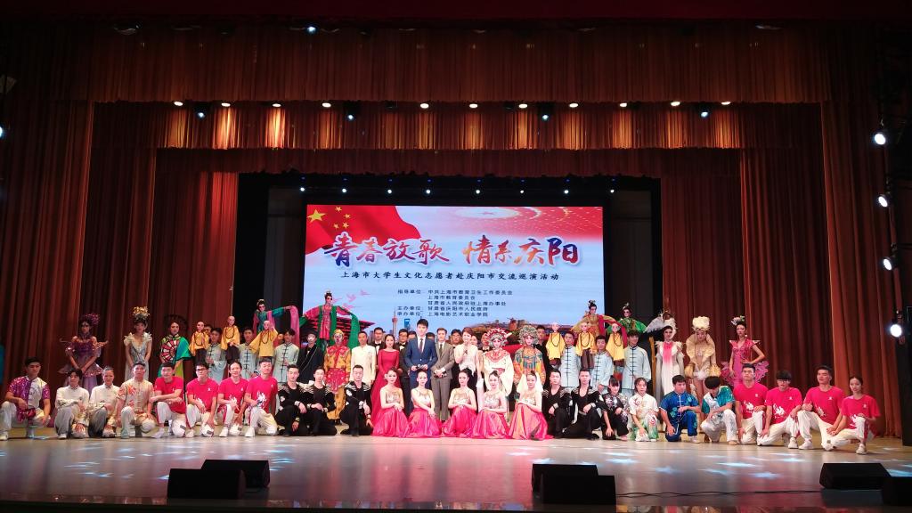 本网讯 10月11日-16日,在上海市教育卫生工作委员会、上海市教育委员会的指导下,“青春放歌情系庆阳——上海大学生文化志愿者文化交流巡演活动”在甘肃省庆阳市举办。此次活动由上海电影艺术学院承办,华东师范大学、上海戏剧学院、上海视觉艺术学院、上海体育学院、上海音乐学院、上海电影艺术职业学院等6所高校共同参与。我校带来了武术表演《武境》和花样跳绳表演《绳彩飞扬》两个节目,随队先后前往南梁革命老区、陇东学院、庆阳市政府礼堂等地为当地百姓送去四场文化大餐。同学们克服了天气寒冷、水土不服等困难,他们用精彩的演出,展示了上海大学生的青春活力,展现了绿瓦学子良好的精神风貌与专业素养。