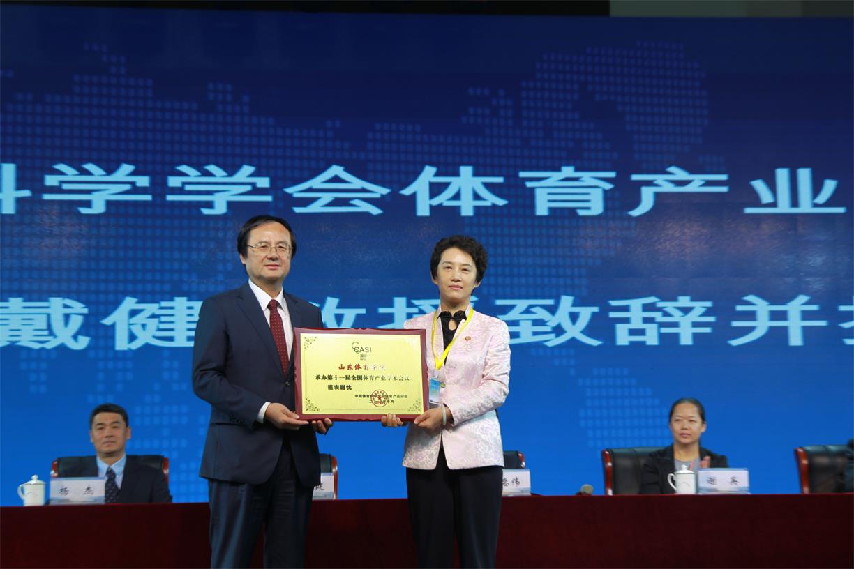 随后,戴健向山东体育学院赠送纪念牌匾。谢英为分会场主持人颁发荣誉铭牌。
