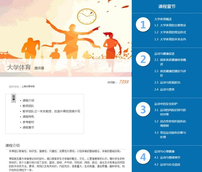 《大学体育》是我校通识教育核心课程。该门在线开放课程汇集我校优秀师资队伍,将课程内容与时代热点有机结合,运用现代信息技术手段,使体育理论讲解与示范演示无缝衔接,学生不仅能学到体育的基本理论知识、多种体育运动项目的实践技能,还能通过优美的视频领悟到体育的美感!真正打造成为一门体育与艺术相结合的精品在线开放课程。该课程上线一个月已有多所大学选修此课,选课人数达到1600人,点击量更是达到了7300人次。