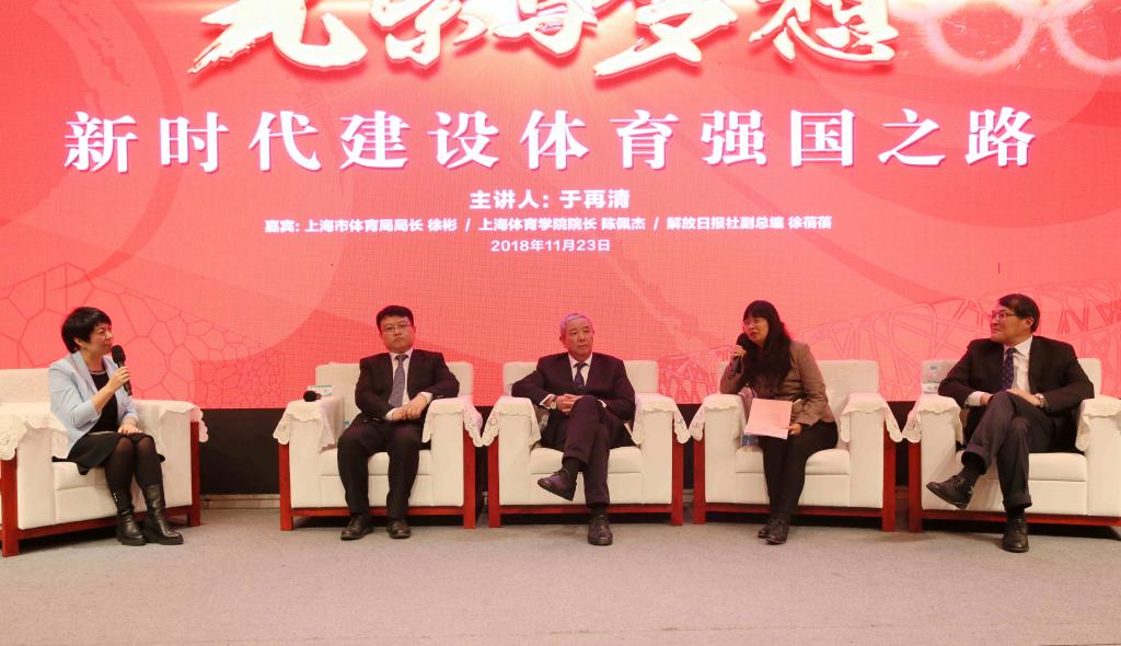 本网讯 11月23日下午2点,由上海体育学院、解放日报社、上海市体育局主办的纪念改革开放四十周年“体育改革路 体育四十人”主题系列活动之“光荣与梦想——新时代建设体育强国之路”高峰论坛在图文信息楼报告厅举行。国际奥委会副主席、国际武联主席、原国家体育总局副局长于再清先生受邀做主旨报告。上海市体育局局长徐彬、解放日报社副总编辑徐蓓蓓及我校党委副书记、院长陈佩杰受邀共同与于再清主席做交流互动。党委书记李崟、原院长姚颂平、原党委副书记王玉林出席本次活动,与400余名师生共同聆听了本次讲座。本次活动由上海文广新闻传媒集团广播新闻中心首席主持人秦畅主持。