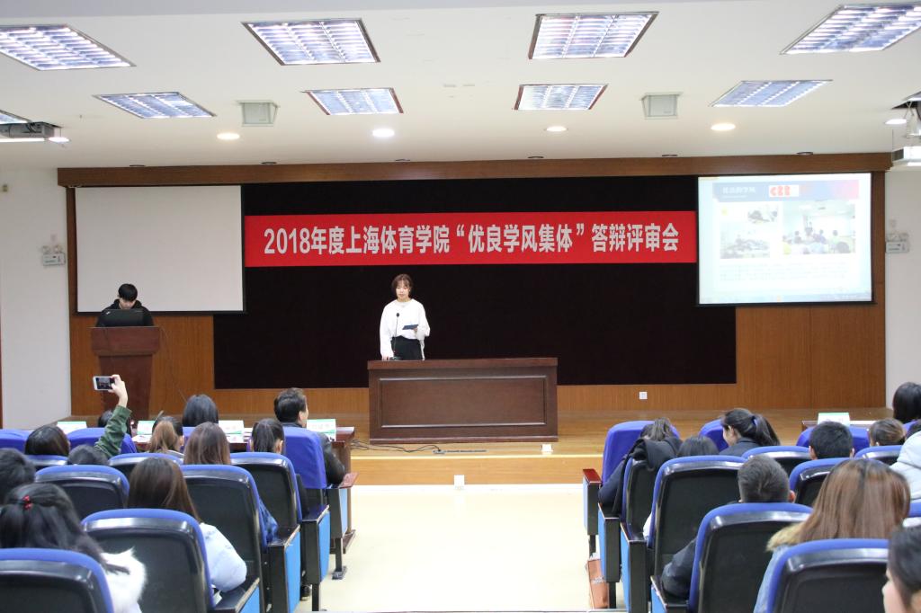 本网讯 12月6日,2018年度上海体育学院“优秀学风集体”校级评审会在学生活动中心报告厅举行,来自各学院初评后推荐的20个班级通过答辩展示争夺2018年上海体育学院“优良学风标兵班”和“优良学风班”称号。学工部副部长唐建华、体育休闲与艺术学院党总支副书记王丽娜、经济管理学院党总支副书记熊静以及其他各二级学院辅导员评委,辅导员学风建设团队全体成员出席答辩评审会。