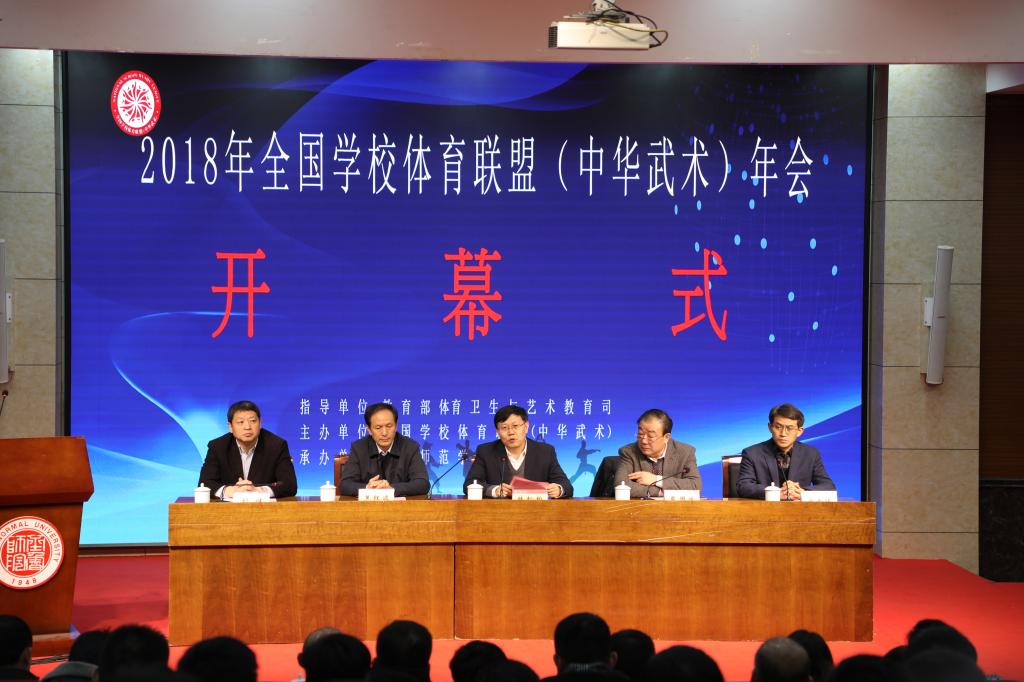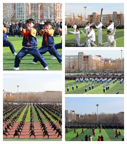 本网讯 12月7日,在教育部体育卫生与艺术教育司指导下,全国学校武术联盟在山东省齐鲁师范学院隆重召开“2018年全国学校体育联盟(中华武术)年会”,来自全国各地60家联盟牵头单位、会员单位的120余名代表出席了开幕式。齐鲁师范学院、青岛大学附属中学等5所山东省“一校一拳”教改学校的4000多名学生展演其武术教改成果。与会代表还围绕武术教改问题进行了研讨。开幕式由全国学校武术联盟秘书长、上海体育学院武术学院院长戴国斌主持。