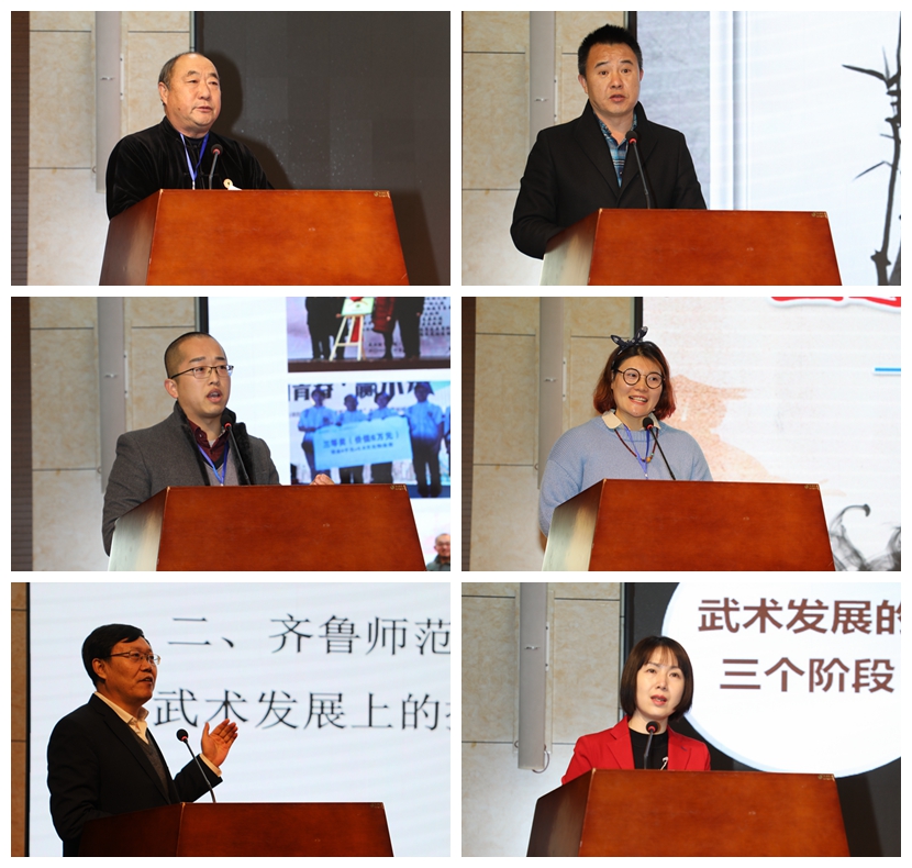 6所学校进行了武术优秀教改经验的介绍。齐鲁师范学院党委副书记、林松柏校长介绍了齐鲁师范学院探索学校武术购买服务的合作新机制,及该校以“平台(Platform)引领、学校(School)实施、政府(Government)指导”的P-S-G新模式推动该校武术发展的新举措。成都市人民北路小学校王丽校长以《“道”“术”合一 向光而生》为主题,在梳理该校武术教改“进校园、进课堂、成教育”的发展历程之后,分享其引入“极客思想”,创建跨界、融合、创生的“武术极客”工作室,并以“由阅读而读武术、由木偶而演武术、由英语而说武术、由美术而画武术、由音乐而唱武术”的学校武术教改新局面。青岛市武术协会刘正海副会长介绍其武术协会以“一拳、一操、一功法”将三铺龙拳走进胶州市102所学校的经验。成都市金牛区迎宾路小学代表周骞书记,介绍其“以套路为根进课堂、以功法为能进大课间、以运用为魂进社团”的教改经验。武汉体育学院张超介绍其幼儿武术“宝宝功夫”在“让男孩顶天立地,让女孩刚柔并济”目标下“拳械结合、队形变化、一物多玩、节奏韵律”的新探索。上海市浦东新区观澜小学邓晓芳老师将其该校教改经验概括为以“进头脑、进教材、进课堂”的“三进”为支撑点,以项目推进为“三进”打前站,以课程跟进为“三进”立支柱,以特色活动为“三进”拓渠道,以展示赛事成“三进”调味剂,以建俱乐部成“三进”催化剂。