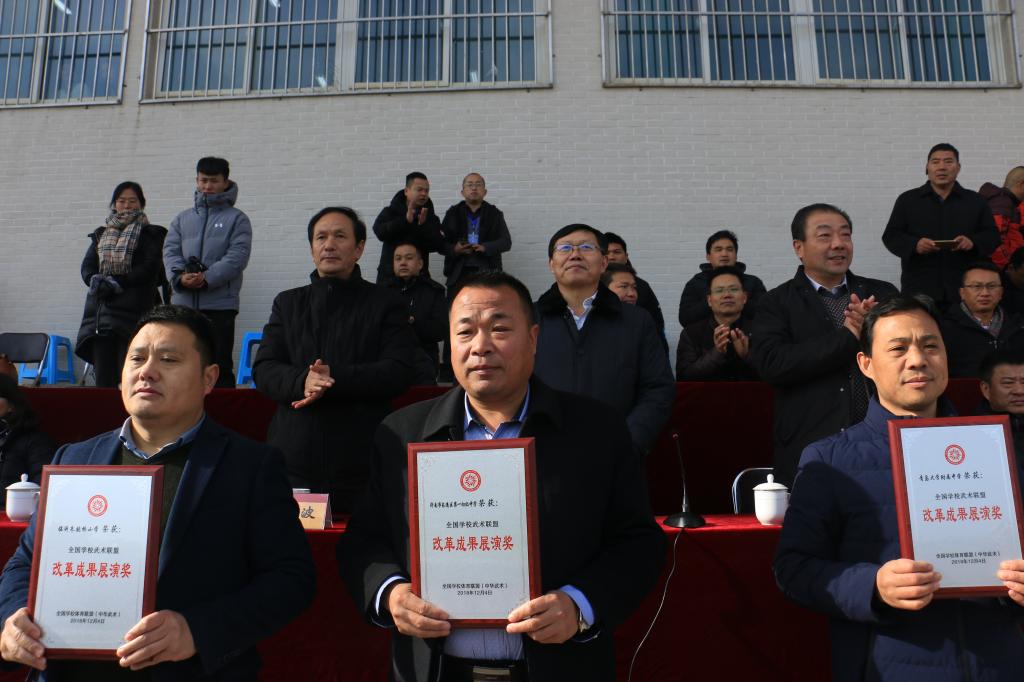 全国学校武术联盟副秘书长、齐鲁师范学院体育学院刘健院长宣读获奖名单,齐鲁师范学院教务处梁承锋处长为5家获得优秀教改视频一等奖的单位颁奖,少林寺武术馆焦红波馆长为13家全国学校武术优秀教改单位颁奖,齐鲁师范学院林松柏校长为7家分联盟优秀牵头单位颁奖。全国学校武术联盟秘书长、上海体育学院武术学院戴国斌院长为本年度3家新增牵头单位授牌。