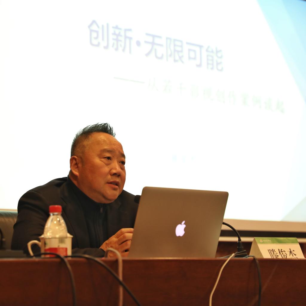 滕俊杰教授以萧伯纳名言开启演讲,他启发大家,我们需要创新,中国必须在创新领域有更大的作为,创新让世界具有无限可能,创新是一个刻不容缓的重要命题。他希望今天的讲座不是授课,而是以分享的形式激发同学们的创新思维,能在未来的工作中、在创意实践中赢得更大作为。紧接着,滕俊杰导演结合个人经历以及相关作品向大家展示亲自参与制作的5个经典案例。
