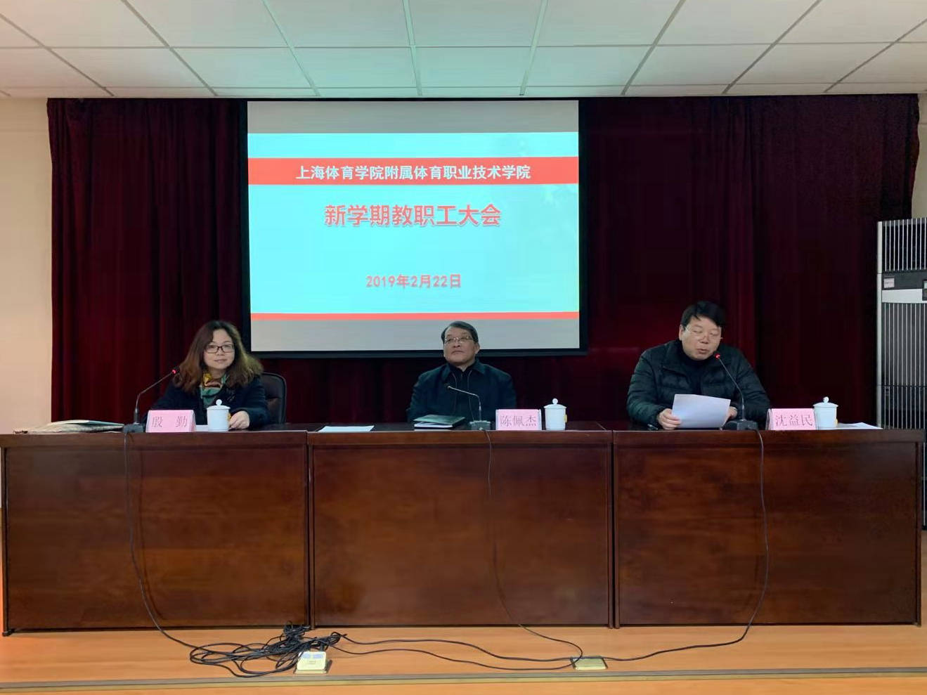 本网讯 2月22日上午,上海体育学院附属体育职业技术学院新学期教职工大会在医技楼召开。上海体育学院党委副书记、院长陈佩杰出席会议,附属体育职业技术学院领导班子及全体教职工参加会议。会议由附属体育职业技术学院直属党支部书记殷勤主持。