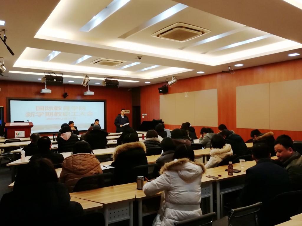本网讯 2月22日上午,国际教育学院召开新学期教职工大会,此次会议是机构调整后国际教育学院首次召开的全院教职工大会。会议由国际教育学院党总支书记刘东锋主持,国际教育学院院长吴贻刚、副院长朱东以及来自汉语国际教育教研室、英语专业教研室、公共外语教研室、留学生办公室等各团队的全体教职工参加了此次会议。