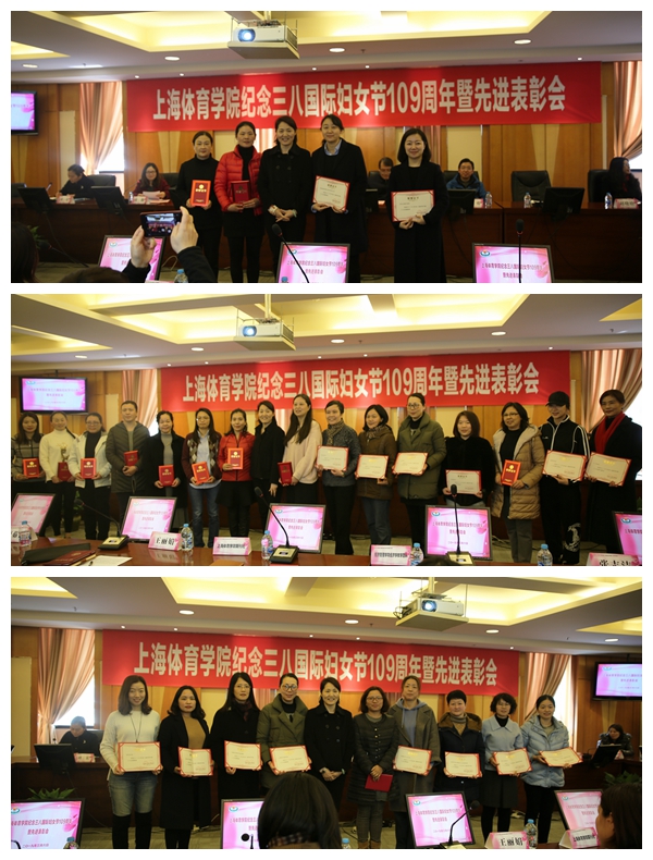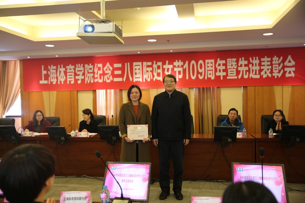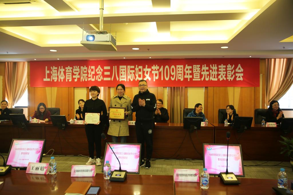 李崟为获得2017-2018年度上海市教育系统三八红旗集体——期刊社和2017-2018年度上海市教育系统巾帼文明岗——经济学教学团队颁发证书;陈佩杰为获得2017-2018年度上海市教育系统三八红旗手——王丽娟颁发证书;杨玲为获得2017-2018年度上海体育学院三八红旗手和红旗集体颁发证书。