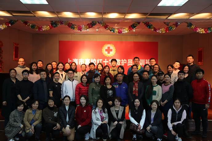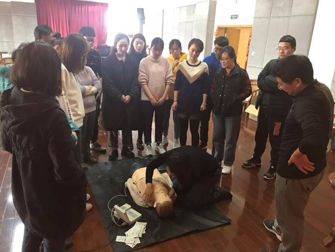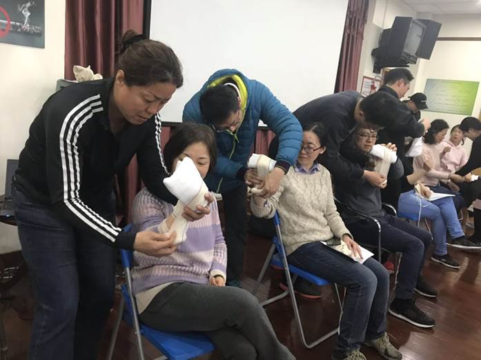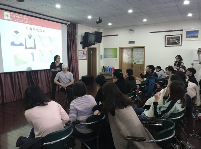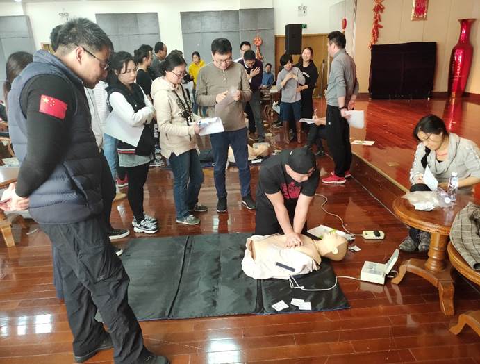 培训首日,上海市红十字会的培训老师们给大家上了一节别开生面的现场应急救护课,主要讲述突发事件以及相应的急救知识。从红十字运动的基本知识为开端,了解救护的基本背景与常识,学会在突发事件中学会自我保护和基本救助。首先,讲师们借助模特,生动地展示在遇到气道异物梗阻时成人与儿童不同的处理方法,规范说明了按压力度与姿势。其次,是现场救护中最常见的CPR(心肺复苏)。在实践环节,学员们借助道具和组队练习现场巩固知识,讲师在一旁耐心指正纠错,培训氛围高涨,学习气氛浓厚。