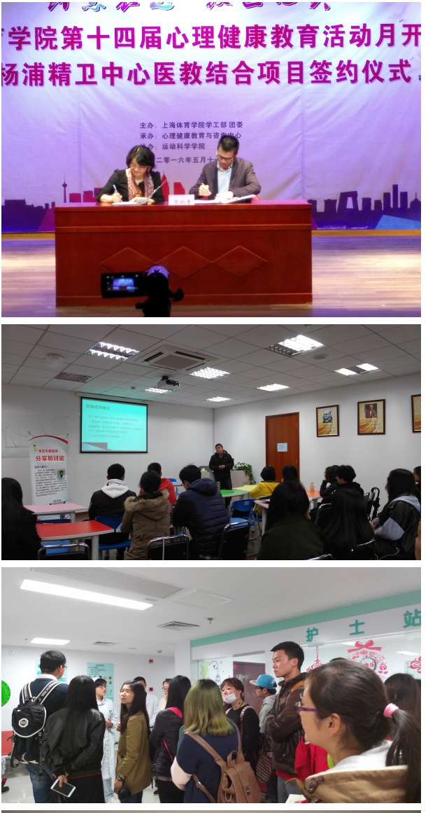 上海体育学院为该项目的建设贡献了自己的一份力量,同时也得到该项目不可多得的支持和帮助。三年来,杨浦精神卫生中心为我校带来四场专题讲座,一次危机个案来校面诊,十余次电话咨询指导,接待近20名疑似心理疾病的转诊学生,接待两次我校师生的参观活动,提高了我校心理健康服务水平。我校也开展各种合作交流宣传活动来反哺医院。2016年,邀请杨浦精卫中心医生代表参观我校释放身心、开发创造潜能、开拓人际关系、提升正向情绪感受力的“舞动心灵”工作坊展示活动;2017年,开展上海市精神卫生中心主办的“面对抑郁 我想对你说”对话征集活动;2018年,开展杨浦精神卫生中心康复人员作品校园义卖活动、“健康心理 快乐人生”世界精神卫生日主题活动、心理专业学生在杨浦精神卫生中心暑期实践活动等。