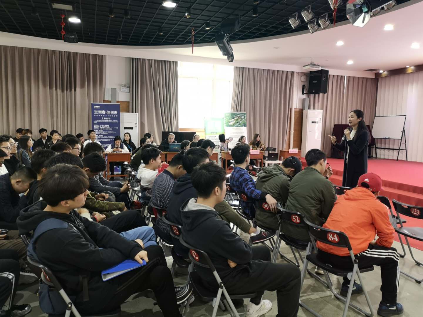 为了提高学生参与度,专门设计了小型的企业宣讲会,吸引了20余家企业参加,提供了近百个就业实习岗位。与体育产业息息相关的企业逐一进行宣讲,输出体育市场的最新需求以及企业的诉求。现场观众积极与企业进行互动,气氛热烈。